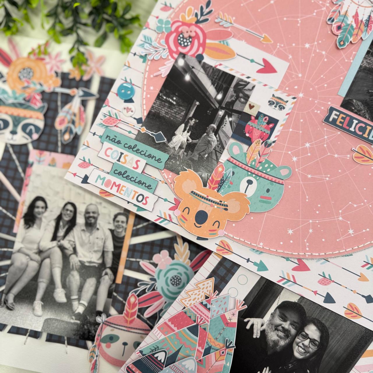 Com apenas uma coleção de papéis, você vai criar 3 layouts 30x30 lindos, com passo a passo em PDF, fotos e explicações detalhadas.